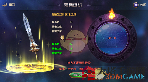 神兵系统是《永恒大陆》的核心玩法之一。类似于武器培养,提升活跃度可获得大量神器能量,用于升级神兵,提升等级。神兵达到一定等级后可突破,武器外观及光效也将升级。